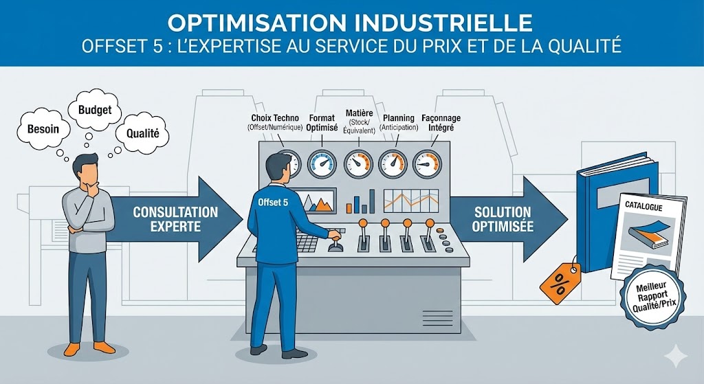 Le prix le plus bas n’est jamais le fruit du hasard, mais celui d’une intelligence de production partagée entre le client et son imprimeur. En faisant confiance à l’expertise technique d’Offset 5 Édition, vous bénéficiez d’un outil industriel de pointe, capable d’adapter chaque projet pour le rendre plus compétitif sans jamais sacrifier l’excellence du rendu final.